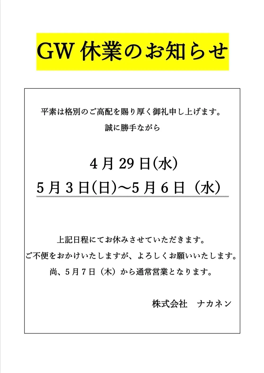 GW休業のお知らせ